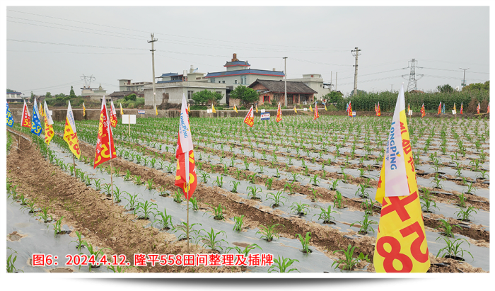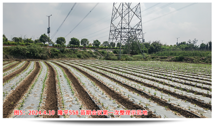 回想年前說要召開苗期會議的時候,大家都有點不知所措,因為沒有先例,客戶也并不看好苗期會議呈現的效果。決定了要做,那就全力以赴,第一個問題就是示范田的選點,要考慮播種時間、地塊條件、地塊面積、交通便捷、人員配合等,權衡各要素最終確定在樂山夾江找地。樂山夾江水源條件好有東風堰灌溉,土質肥沃常年種植蔬菜、藥材,地勢平坦面積規整更易找到幾畝連片地塊,播種時間較早能夠保證4月中旬苗子適合觀摩,種植戶經驗豐富懂得控制密度和水肥管理。從年前初選溝通,到最后落實,由于交通、前茬、面積等因素,前后也溝通了6位種植戶、經歷了3次換地,才最終在2月20日確定了地塊,并于3月5日完成播種。設計之初首先考慮的就是密度,該地塊密度有2種設計,一是寬窄行(雙株)的3200株/畝,二是等行距(單株)2600株/畝,同時保證外觀性狀和產量性狀都有較高的體現。其次是保證整田無雜草,苗齊苗壯,從播種短短一個月時間內我去查看了4次。播種時已做好了地塊除草,確定好行距、株距,然后每窩3粒播種;第一次查看,及時整理薄膜的遮蓋,了解墑情、苗情,如出現整箱出苗不好,及時灌溉保苗;出苗整齊后,及時補苗肥,促進長勢;苗期會議前,插牌、美化地塊,間苗,祛除弱苗,展現示范地的最佳狀態。田間管理實操工作繁重且枯燥,但當看見客戶在地里笑著拍攝隆平558的情景,就讓我依舊相信每一份努力的背后,一定會有驚喜!